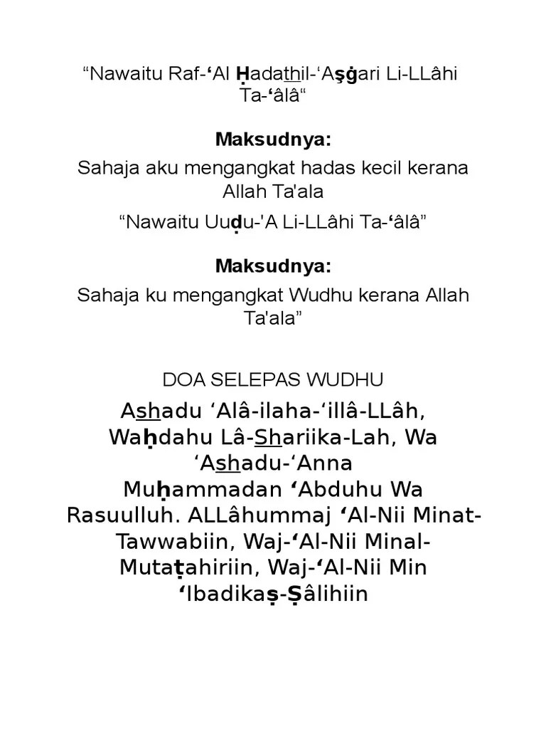 Niat semasa wuduk adalah sebahagian dari . Nawaitul wudu a liraf'il hadasil asghari fardhan lillahi taala. Bài viết về niat mengambil wudhu dan bacaan doa selepas wudhu (jawi dan rumi) . Niat mengambil wudhu dan bacaan doa selepas wudhu (jawi dan rumi). Sahaja ku mengangkat wudhu kerana allah ta'ala. Kemudian doa selepas berwuduk, terdapat amalan ringan dalam bentuk doa selepas ambil wuduk yang boleh dibaca selepas berwuduk . Lafaz niat wuduk & doa selepas berwuduk (ibadah) tahun 1 (video 12). "saya niat berwudhu untuk menghilangkan hadas kecil .